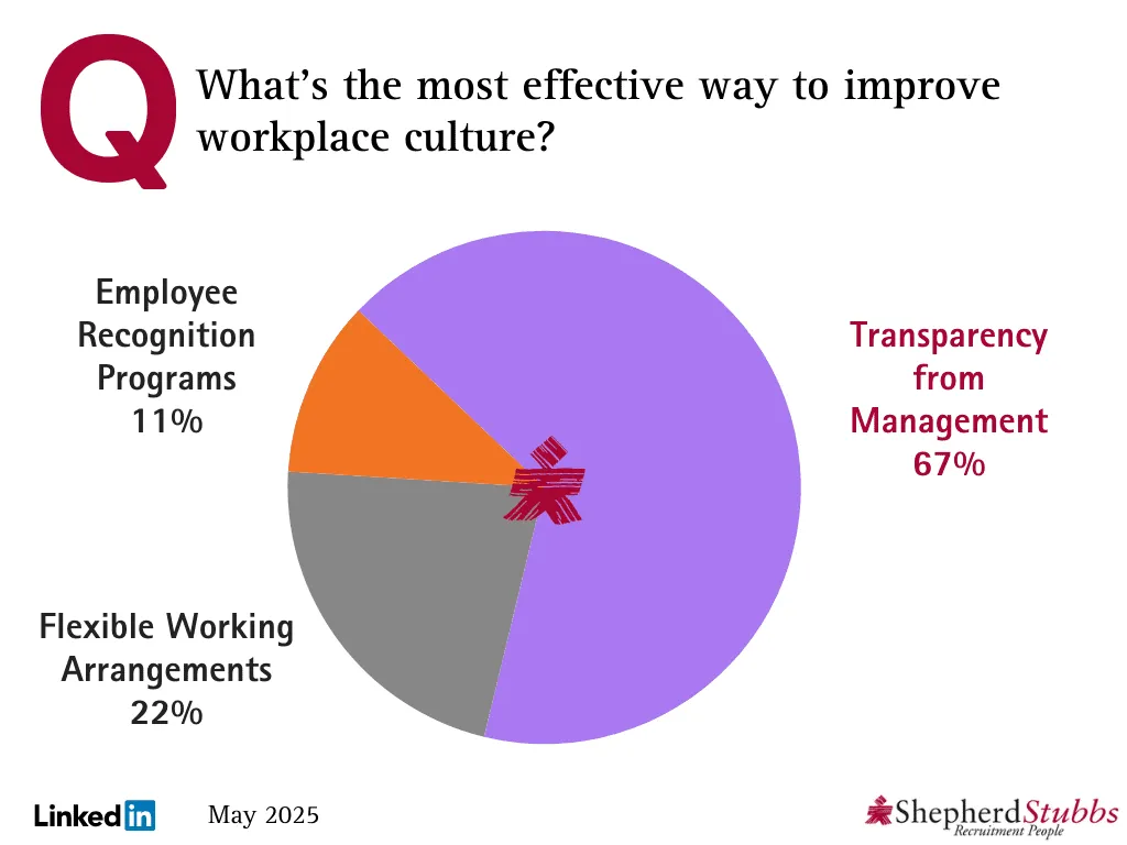 In our May 2025 LinkedIn poll, we asked our network: “What’s the most effective way to improve workplace culture?” The results highlight a clear consensus around one key theme—trust and openness.